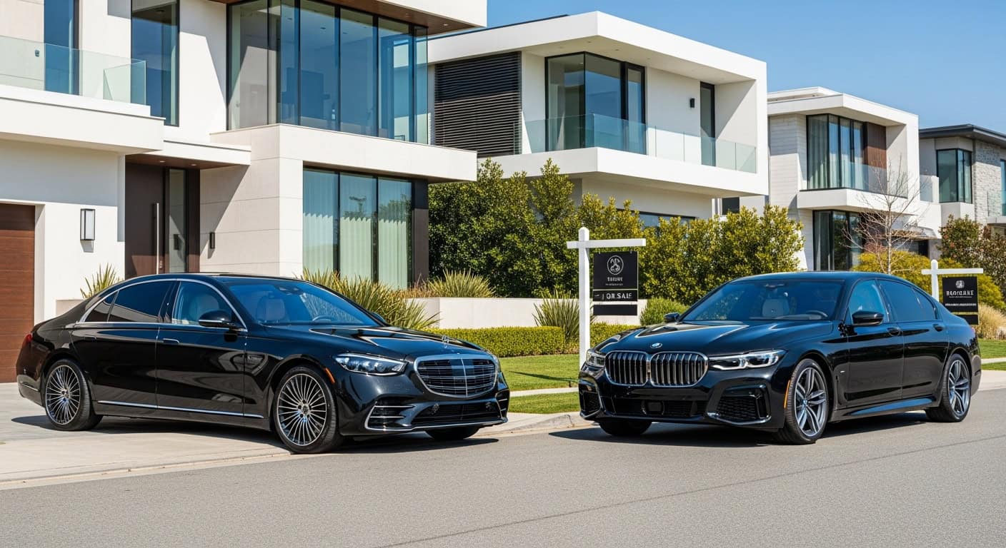 The driver positions at the front entrance of each property. No parking garages. No walking. The buyer exits the vehicle at the listing. When the viewing ends, the car is waiting at the same spot.